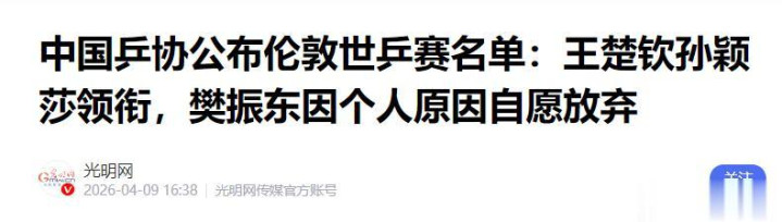 光明网——中国乒协公布伦敦世乒赛名单:王楚钦孙颖莎领衔,樊振东因个东说念主原因自发淹没