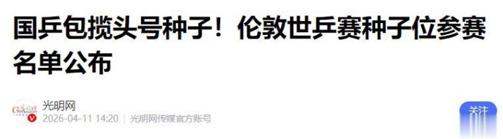 光明网——国乒包揽头号种子!伦敦世乒赛种子位参赛名单公布