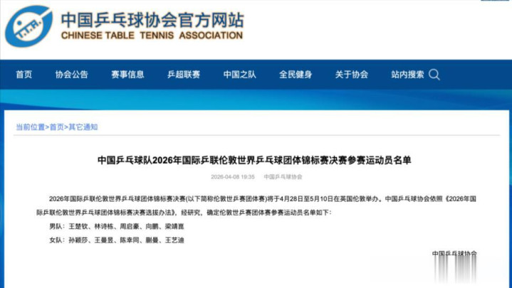当国乒崇拜公布2026年伦敦世乒赛团体赛的参赛名单。