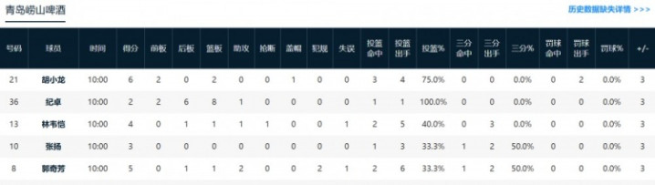 青岛:胡小龙6分2篮板,郭奇芳5分1篮板2助攻。
