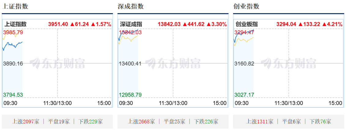 规模北京本领10:13,上证指数高潮1.57%,报3951.40点;深证成指高潮3.30%,报13842.03点;创业板指高潮4.21%,报3294.04点。贵金属、民航、CPO、交易航天等地点领涨。