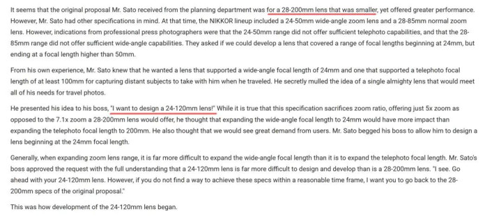 当前尼康的Z24-120F4镜头源自那里?看了著作后知谈了,底本是当年镜头打算师的个东谈主方针,他不想作念28-200镜头,而是要作念一个广角24mm起步,长焦端跳跃100mm的镜头,终末就有了24-120。