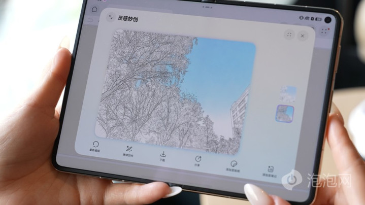 AI创作功能也很强,华为札记里的AI灵感妙创唯有顺手涂鸦、拍张像片,就能生成模样包、普通穿搭、家装遵守图,手残党也能秒变野心师。它还在手机上首发天生会画App,各式笔刷齐有,顺手画画、给像片加创意,可玩性很高。